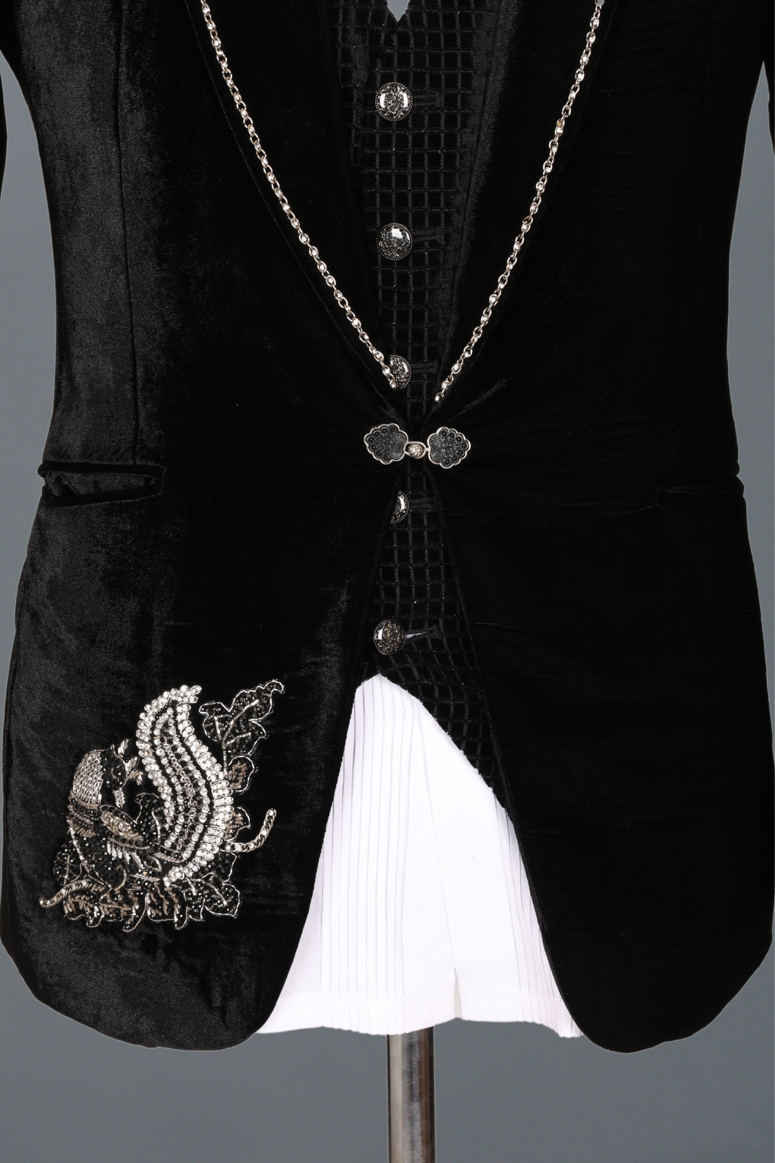 - Fabric: Premium suiting fabric with intricate threadwork