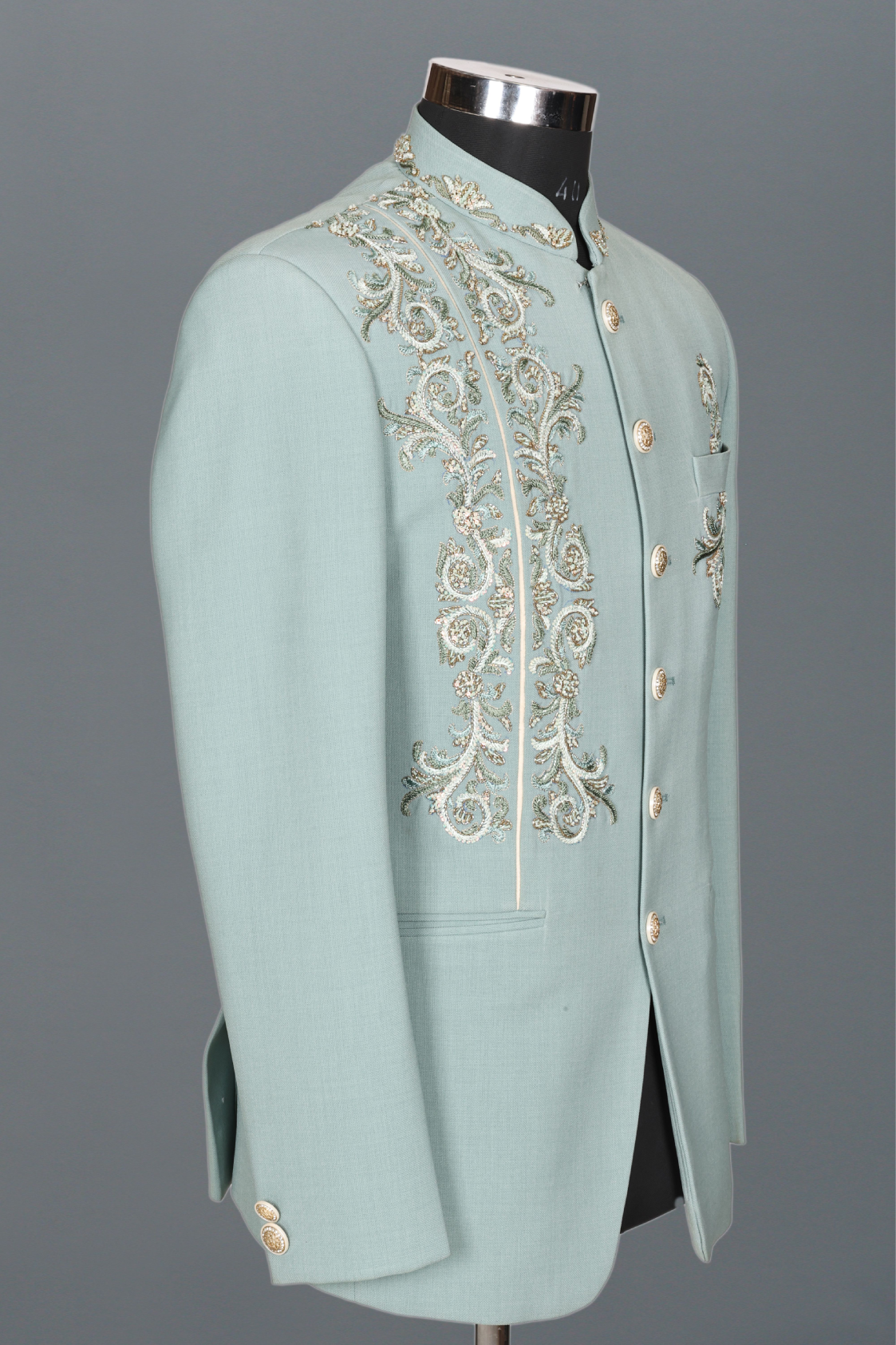 This pastel green indo western is a sophisticated blend of tradition and modernity. The jacket is adorned with intricate golden thread and bead embroidery in a regal vine pattern, complemented by gold-toned buttons for a luxurious finish. A refined pick for weddings, receptions, and festive celebrations where subtlety meets grandeur.